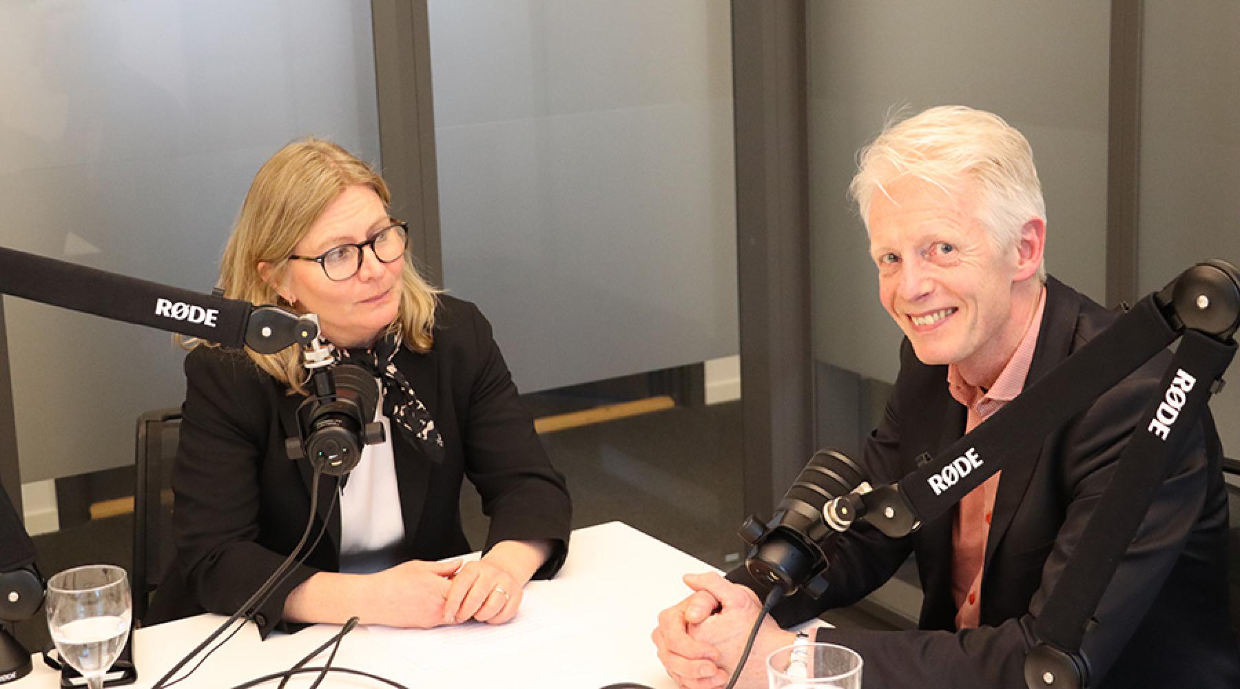 Malin Johansson och Anders Houltz (fr.v.) samtalar med varandra i Ekonomi – den nya näringslivspodden från Tysk-Svenska Handelskammaren.